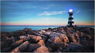 LED Bild Steinküste mit Leuchtturm. Leuchtturm mit wechselnder LED Lampe Licht (Farbspiel)XL Bild, riesig , LED Stimmungsbild mit 1 LED mit Farbspiel und 90 cm Breit x 50 cm Hoch Batteriebetrieb , nur 0,06W, Leuchtbild auf Leinwand mit An und Ausschalter , Batterien inklusive. Riesiges Bild, LED