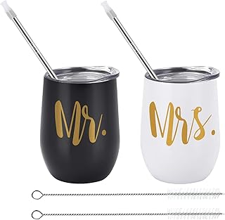 Weinbecher Hochzeitsgeschenk für Brautpaar, 12oz Mr Mrs Weinbecher für Hochzeitsgeschenke, Edelstahl Weinbecher mit Deckel und Strohhalmpinsel für Brautpaar, Jahrestag, Weihnachten
