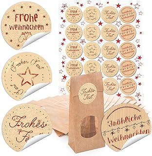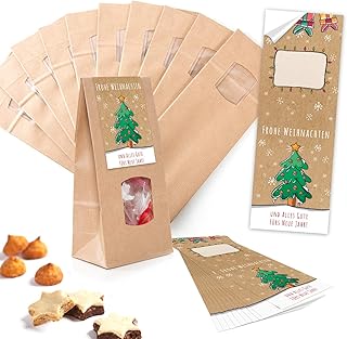 Logbuch-Verlag 24 Weihnachten Papiertüten Keksbeutel Blockbodenbeutel MIT FENSTER und Weihnachtsaufkleber Verpackung Tüte Beutel Lebensmittel Gebäck 7 x 4 x 20,5 cm